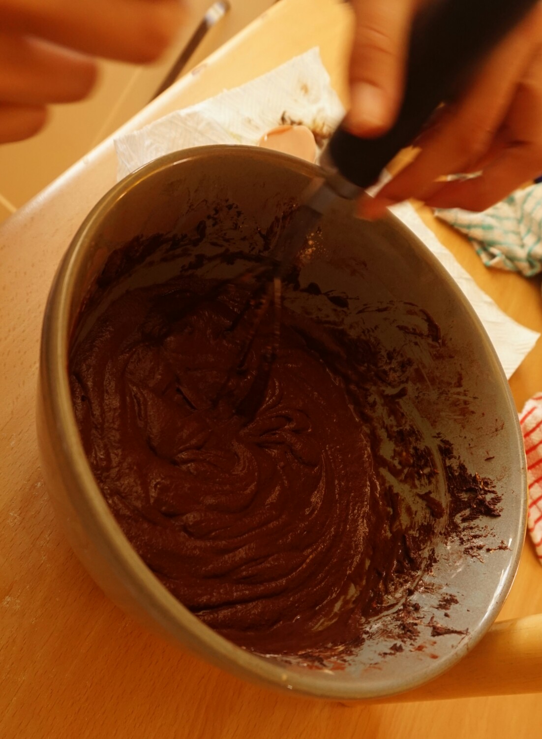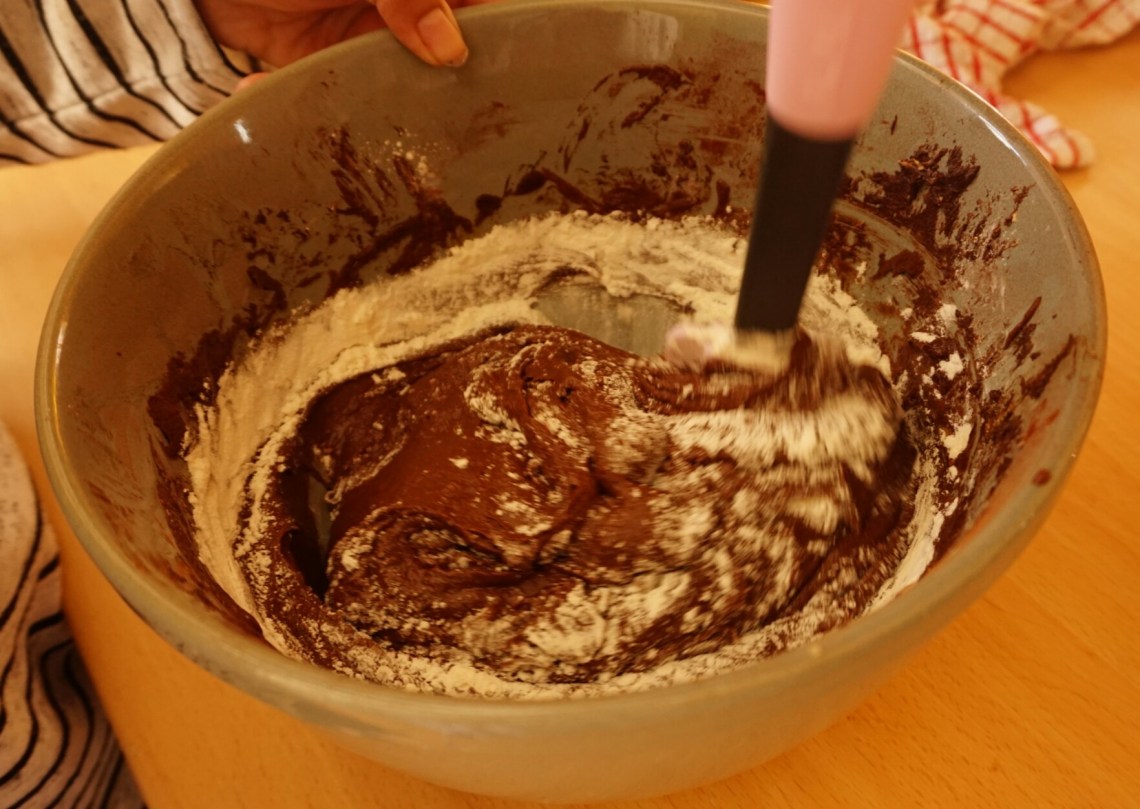 4. Add a quarter of the flour and mix well. Add the eggs one at a time (beating well after you’ve added each one), then fold in the remaining flour.