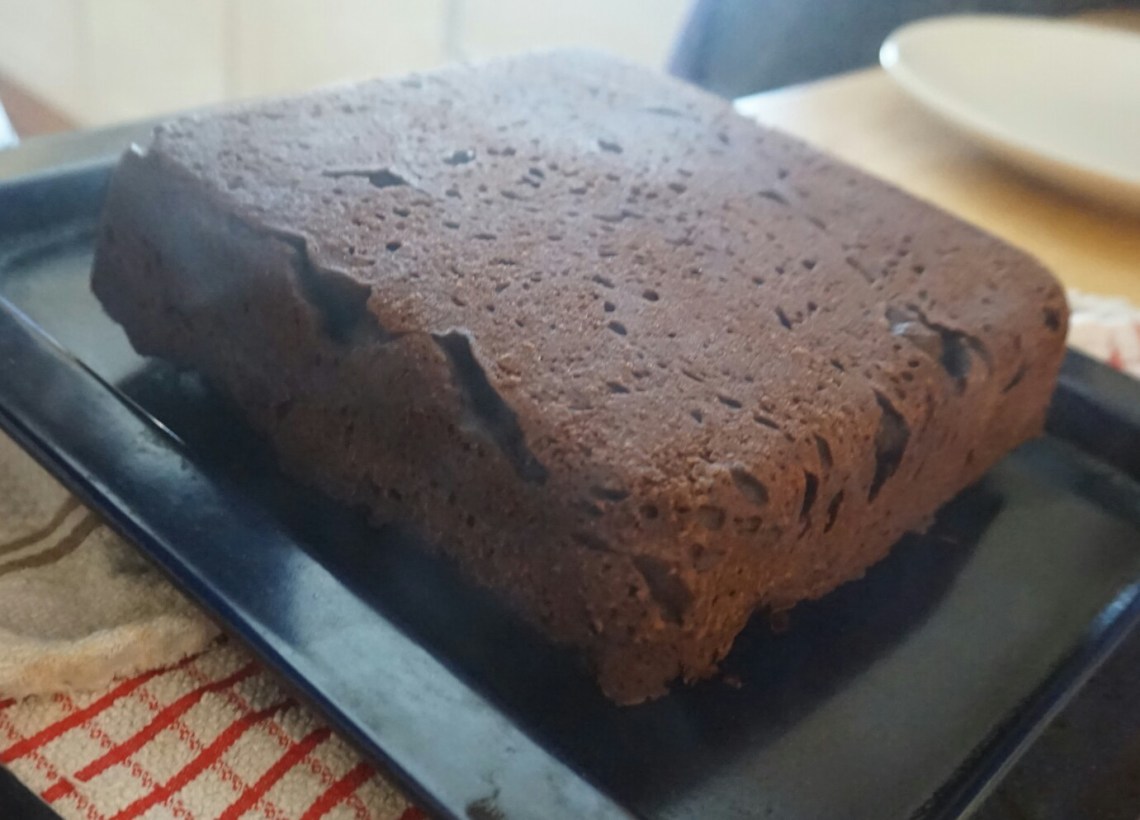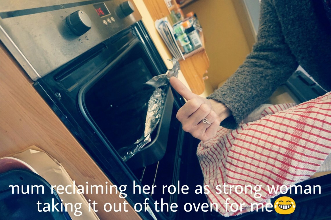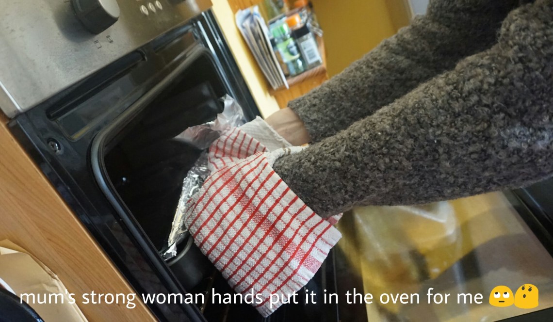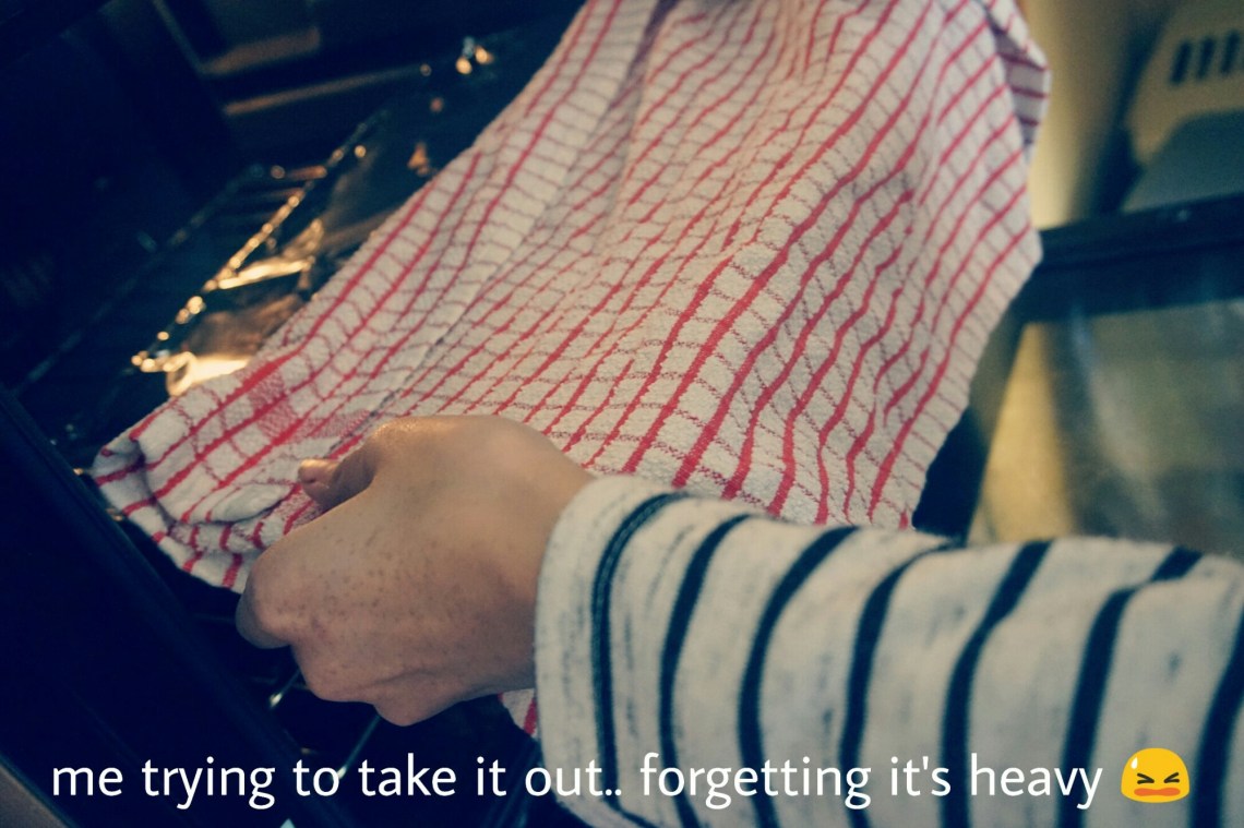 7. Cover the tray with a large piece of tin foil, folding it over the edges to secure and place in the oven to steam for 30-35 minutes (times may be different as I changed them over from the individual ramekin recipe). My mum put it in the oven for me as it was bloody heavy! If you want to check five minutes early if it is cooked, don’t worry it won’t sink π