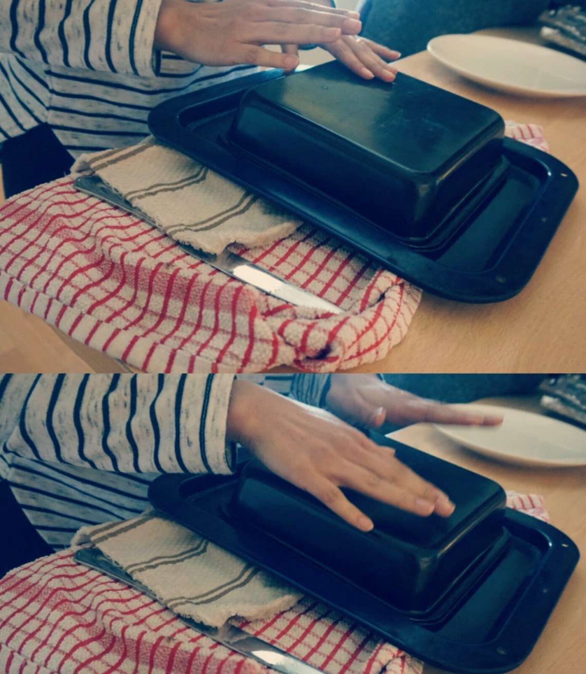 9. Here’s the part I was worried about too. Don’t wait for it to cool down. Tap underneath the tin. Then get a plate and place it over the top of the tin. Flip it over so that the plate is right side up with the tin upside down on top ππ and tap the tin again…(I softly played the drums on it π) and then when you are ready, lift the tin off of the plate whilst tapping it…..Go on!…. I’ll go stand in the corner of the room π…..ππ
