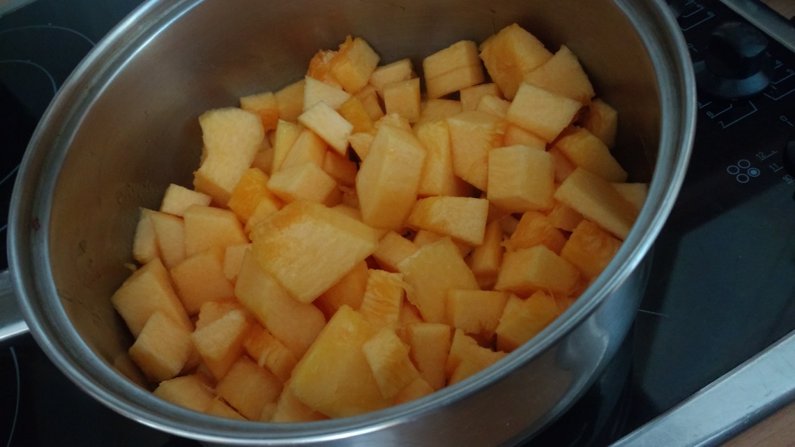3. Saute the pumpkin in a pan with the butter for 5 minutes (this took a lot longer for me as I chopped up way more than 100g of pumpkin 🙈😂 do this stage until the pumpkin is not like a load of bricks and is softer 😂). Then mash or blend it! (Make sure it’s cooled down though or you may melt your chosen utensil 😬🙈). If you mash it like I did, don’t think it’s gone wrong if it still has small lumps of pumpkin in it as it will cook down later anyway! 😂).