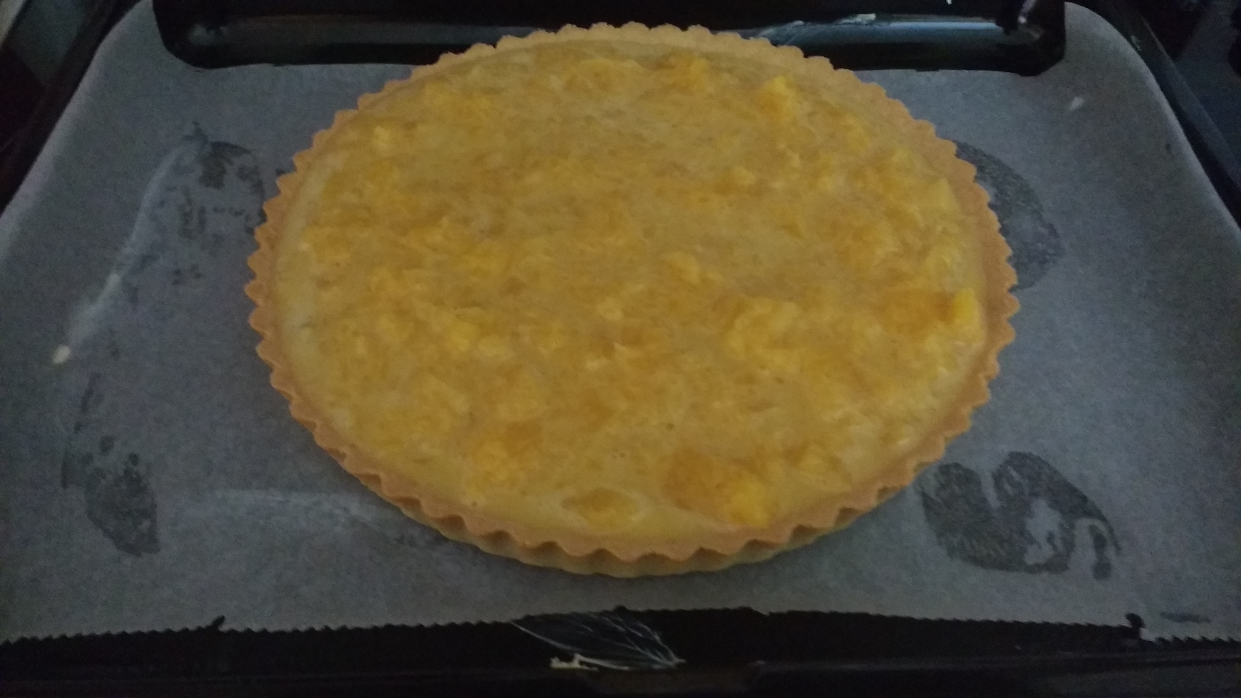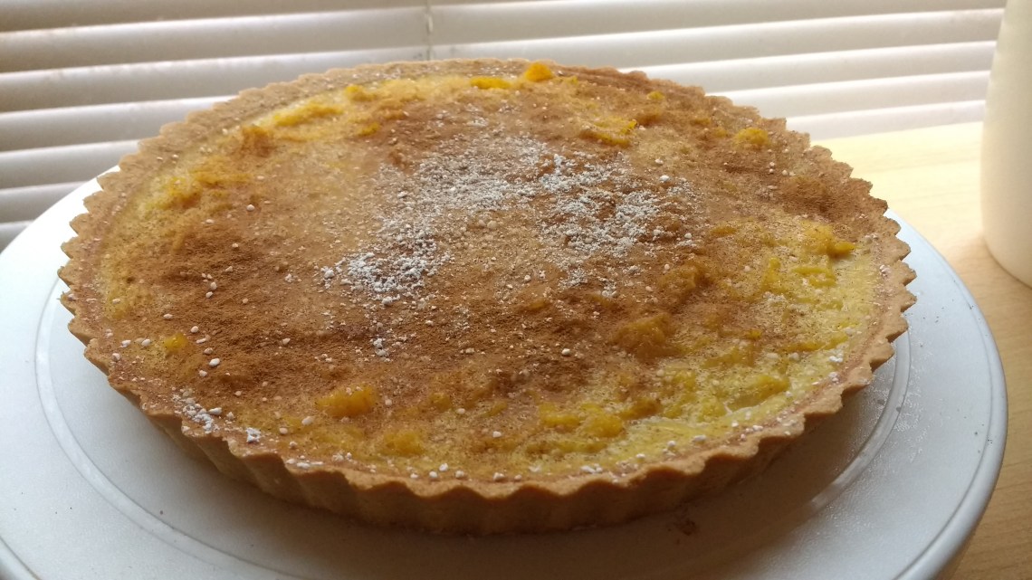 4. Stir in the caster sugar, spices and cream until combined. Then whisk in the eggs and pour into the pastry case on a baking sheet. At this stage it oddly resembles sick but don’t worry! It doesn’t taste like it…I’m joking I didn’t try it until it was cooked and you shouldn’t either! 😂 Bake it for 15-20 minutes (longer if the mixture has not set).