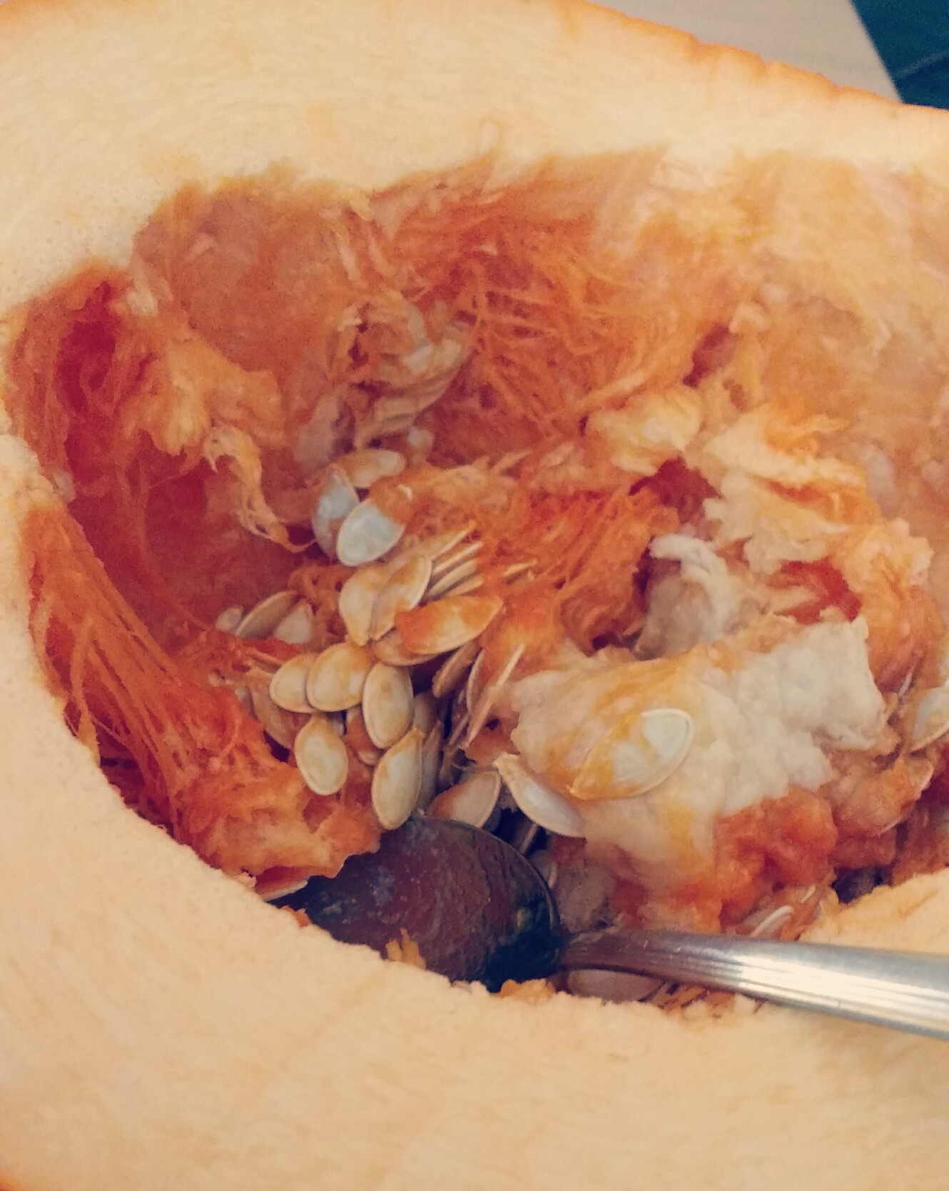 2. Prepare the pumpkin. My mum and I scooped out the seeds (or pumpkin brains as I couldn’t help but call them 😂) and cut out as much as we could get at!