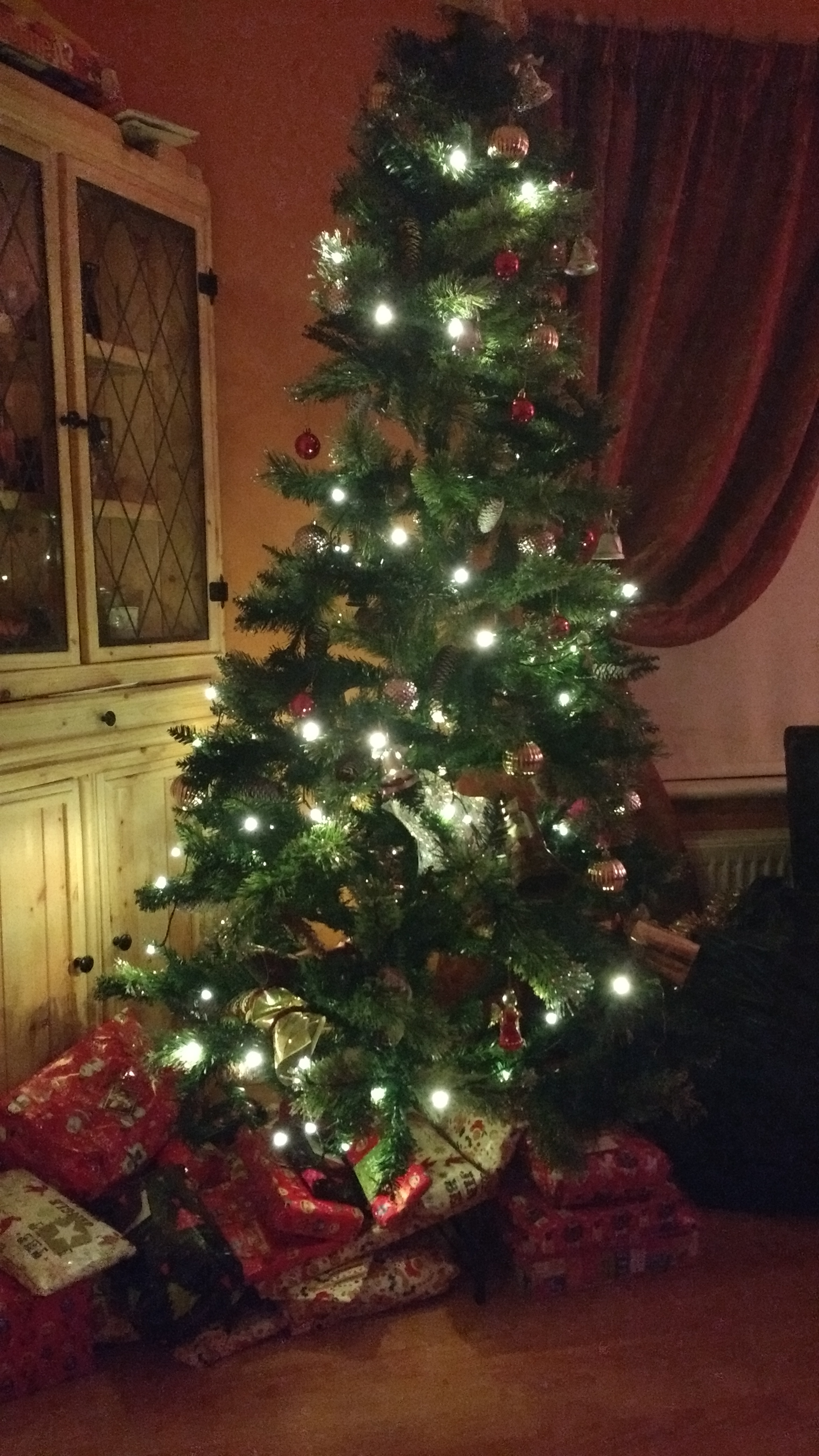 The picture doesn’t do it justice, I swear! 😂 In the light it looks a great deal fuller but I like it in the dark with the fairy lights on 😍 We tried sticking to a theme this year of silver, gold and red baubles as well as some red crystal angels that somehow made their way on much to my annoyance 🙄😂. Since this picture was taken it now has crackers in it and it had some chocolate baubles but our dogs kept discreetly going for them 🙈😂 Toby would floss his teeth up against one in particular whenever he walked by it so we removed them all just to be on the safe side! 😂. The heart of our tree is my sister George’s star if you can see it! 🌟💕 that has gone in all of our Christmas trees since before my sister Kate and I were born. It was made by my mum and was first put on the tree when George had her first and only Christmas ❤