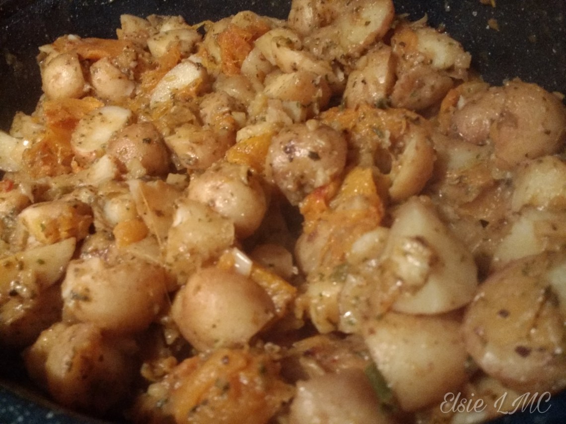 5. Take the pumpkin out of the oven and pour the potatoes over it and stir it all in. Put it back in the oven until the potatoes are cooked.