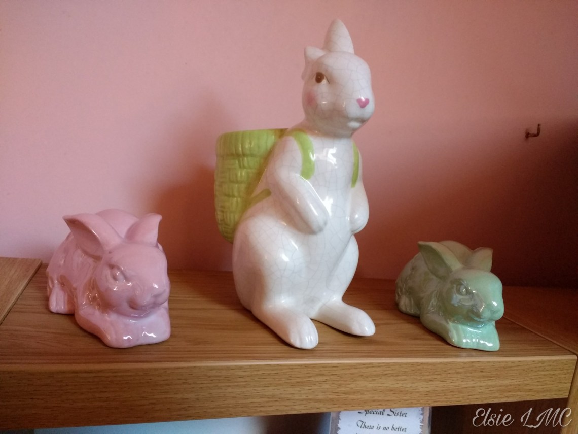 Three of the cutest rabbits! The middle one is a delicate porcelain and is neatly painted with thin lines that make it look like it was put together piece by piece. It is carrying a big green bag and I’m still trying to decide what to place in it! The two little bunnies accompanying it are gorgeous silky colours and I can’t stop myself from looking at them.