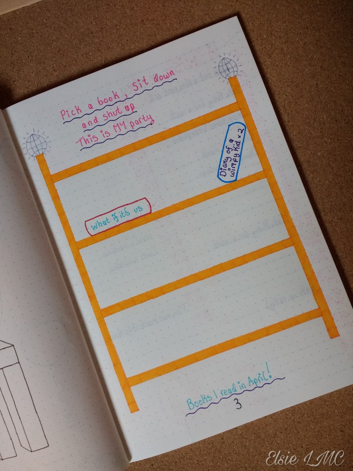 You can tell I was in a mood when I designed the next page for the books I actually read. “Take a book, sit down and shut up. This is MY party” πŸ˜‚ I didn’t finish a lot of books because I’m reading so many at the same time (oh the struggle πŸ˜‚). The best kind of party would have a space dedicated to reading πŸ™Œ I’ve always wanted to have a bookcase page even if I was to never have a bullet journal but I think I might make it smaller in May to compensate for the empty shelves and not make myself feel guilty πŸ˜‚ Or maybe I will draw the shapes of books to fill it up and only write on the ones I’ve read πŸ€” I realize now that I’m after telling people to take a book quite forcefully from the shelf when there isn’t that much choice on them πŸ˜•πŸ˜‚ I’ll have to improve upon that next time!