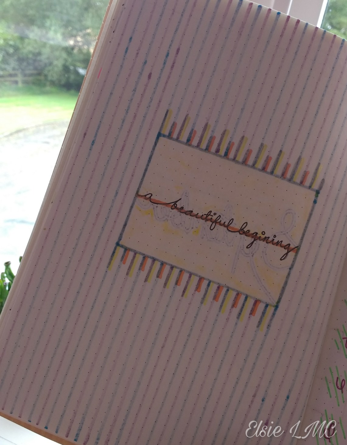 I was going to skip a page as the ink from my September announcement goes through onto the next one and I didn’t want to ruin my Gratitude design but then I thought of a way it could be used! I acknowledged the ink likes that were coming through and shaded in some of them with brighter glitter pens, drawing a cozy blanket of sorts to signify that Autumn is on the way 🍂. Then I wrote a motivational quote “a beautiful beginning”….kinda left out an “n” in there but you can’t really tell with the orange line going through right? 😅 You know, the line that caused so much trouble on the previous page? Yeah that line 😂.