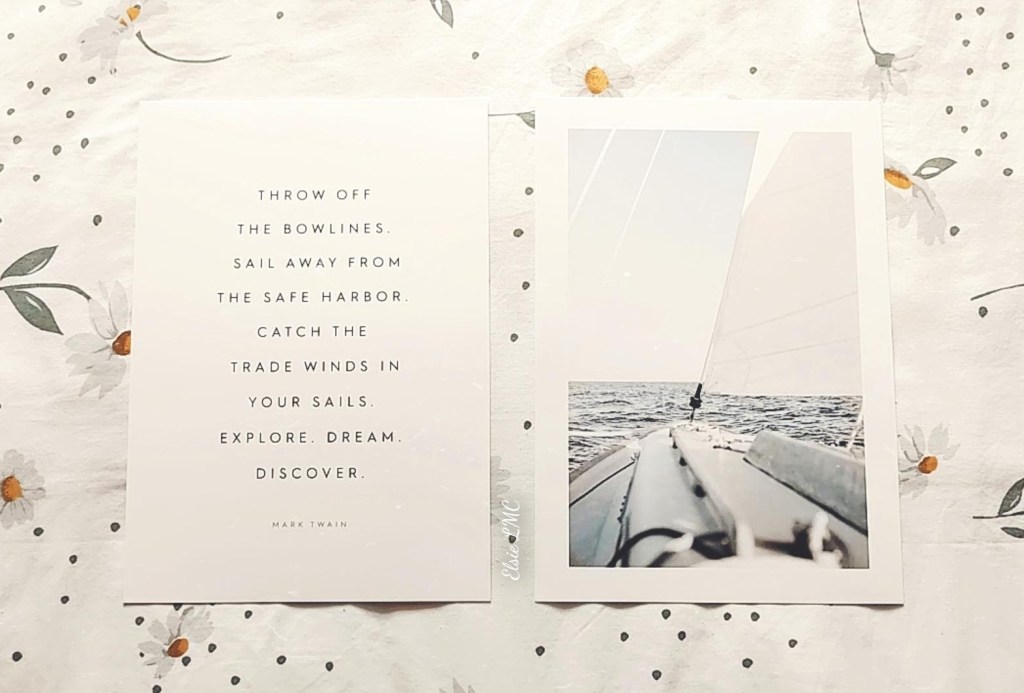 Now it’s time for two prints I plan on placing beside each other under the theme of travel and adventure! (I’d like an abundance of both please 🍃🥺🤣). It is a goal of mine to one day go sailing and that’s been spurred on by not only my surroundings but also through reading about what the experience is like in the blogging community (it sounds incredible! ⛵). Although I’d more than likely be sporting those “fashionable” seasickness pressure bracelets I still want to make it happen 😂. These posters bring to mind the soul-stirring concept of the great unknown and I love how well the thought-provoking text (called Explore Dream Discover) goes with the scenic view of the boat amongst the waves named Sail!
