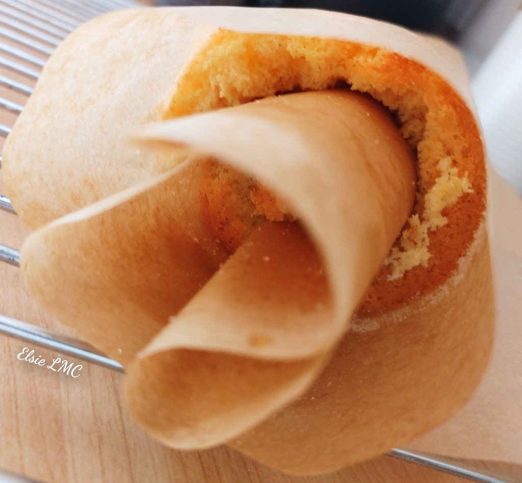 7. When the sponge has done it’s time flip it over onto the sheet of sugared parchment (that’s fun to say). Remove the tin and carefully peel of the layer of baking paper it went in the over attached to (not the newly sugared sheet, don’t wanna be making that mistake! π€£). While it’s still warm, gently roll the sponge from one of the short sides either end. I was nervous to do this as it’s where it could have all gone wrong but it wasn’t that bad actually! All you have to do is take your time and keep the sponge attached to the paper as you roll (this step is way easier than rolling out without the paper I’ll admit! ππ). One you’ve done that, set it aside in it’s rolled up form on a wire rack so that it can continue to cool down! π₯