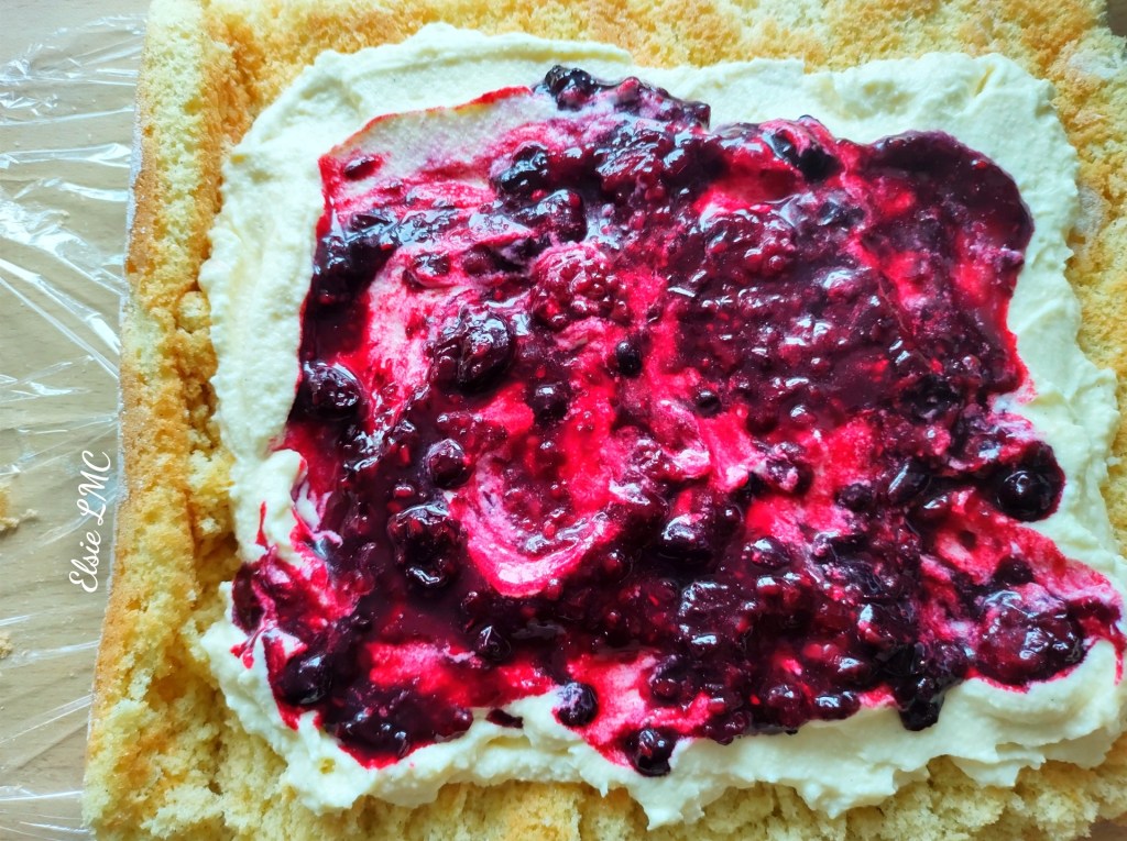 10. Unroll the sponge onto a large piece of clingfilm, remove the parchment in preparation of packing it with goods that will most likely just pour back out. The pressure was well and truly on π . Then spread over the filling leaving a 1cm border (give or take but mostly give because again, I didn’t want it to just come flooding back out again) and then drizzle it with the compote!
