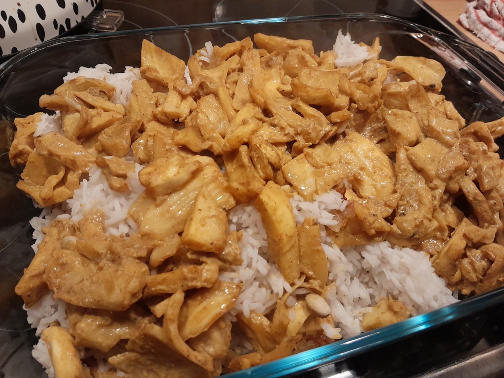 This biryani was made with jackfruit (Can you tell I’ve been using a plant-based cookbook? 🤣) and even tho I added bay leaves, cinnamon sticks, cardamom and peppercorns the jackfruit still lacked flavour which is a shame. You could taste a subtle hint of herbs but it just wasn’t doing it for me which is a shame as it was a tricky recipe to follow.