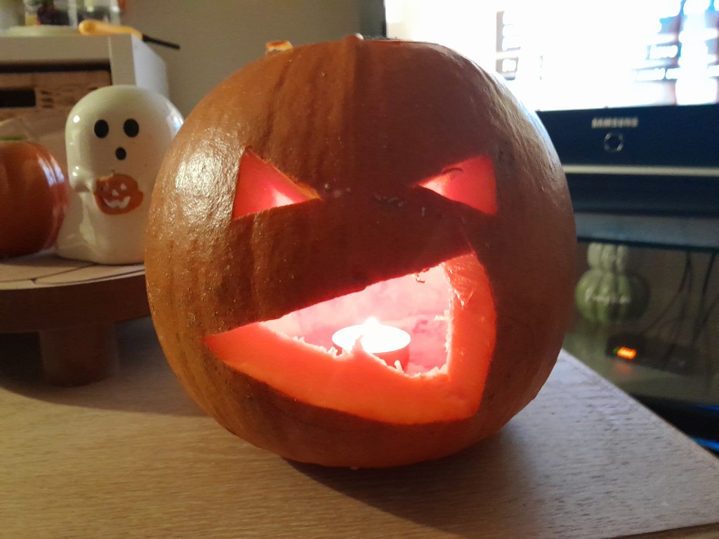 I decided to keep my pumpkin super simple and it was fun to do! I kinda messed up the carpet even tho I put a towel down so I’ve got to clean it today π€. Anyway, my sisters pumpkin was way better than mine as I’m sure you’ll agree!