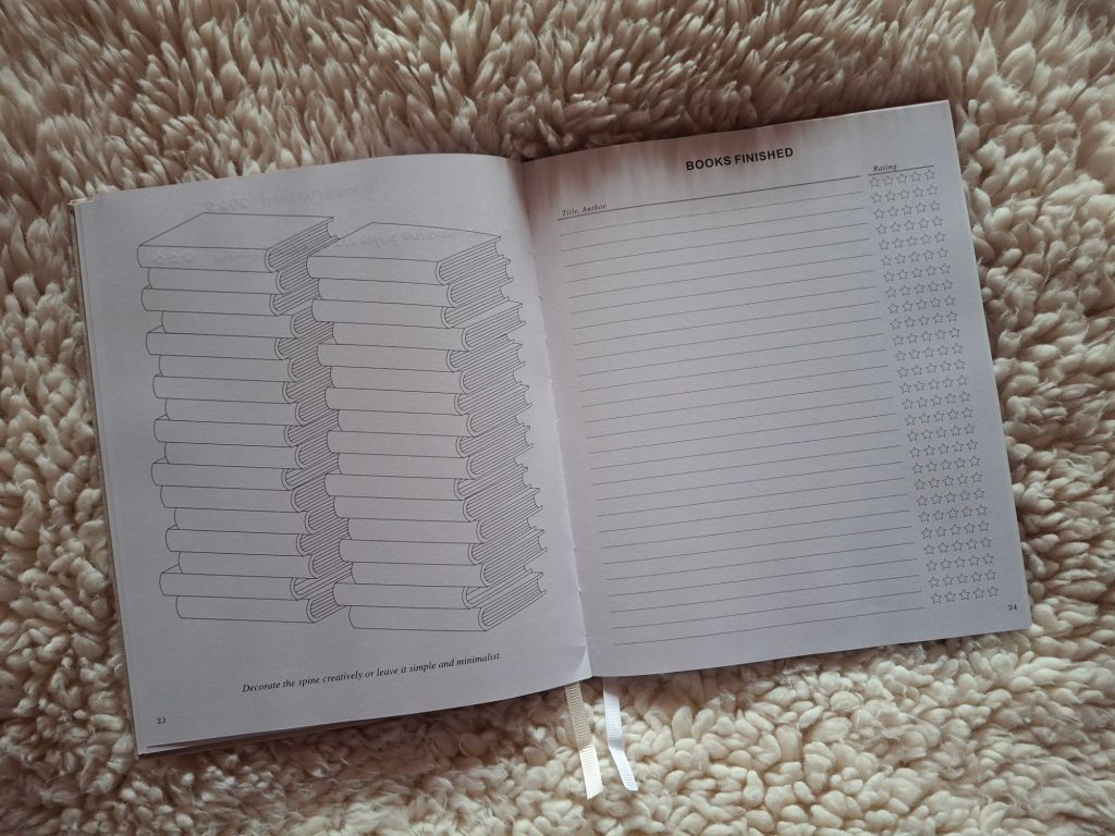 Next up there’s a reading wish list, a books lent out and a books borrowed page and then on to my favourite bit, the books finished section that features more book spines to write down the titles π alongside lined pages.