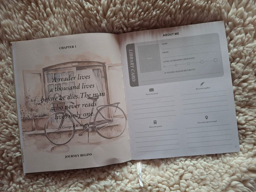 The cover is a soft texture and “reading journal” is embossed on the front, it was available in either grey or beige and it was a tight call but I decided beige called to me π. It has two material bookmarks and a page to introduce yourself, asking what level your reading obsession is, this book might just have to explode with my answer and that will have to be okay, at least I’ll have documented it here first π€£.