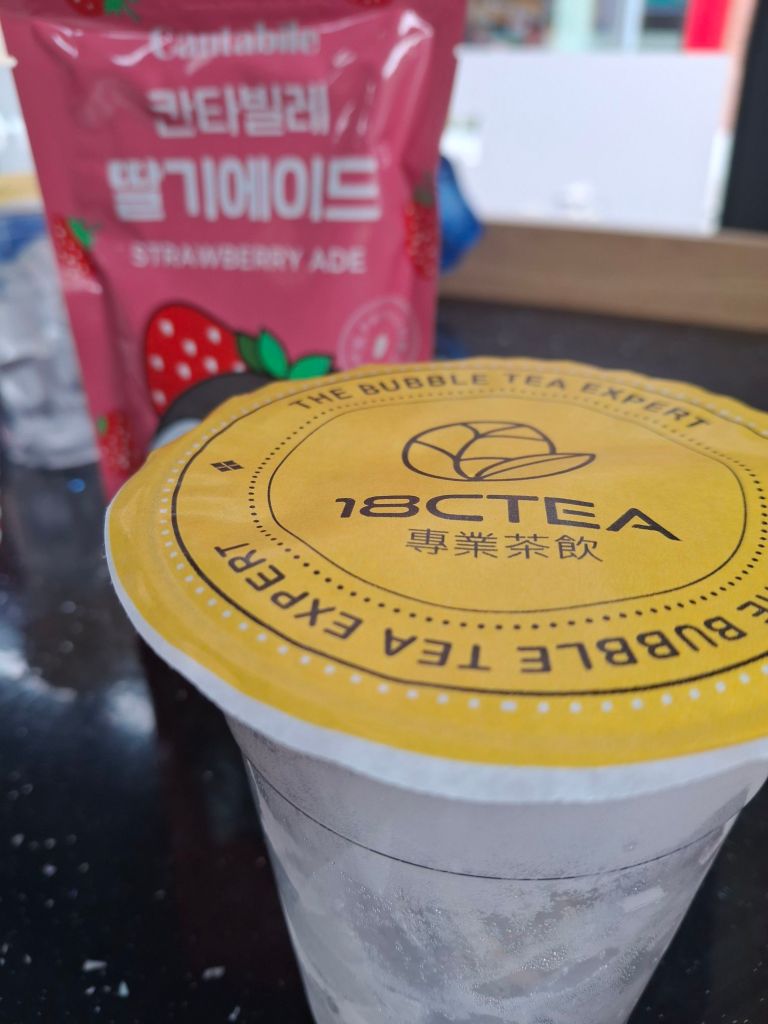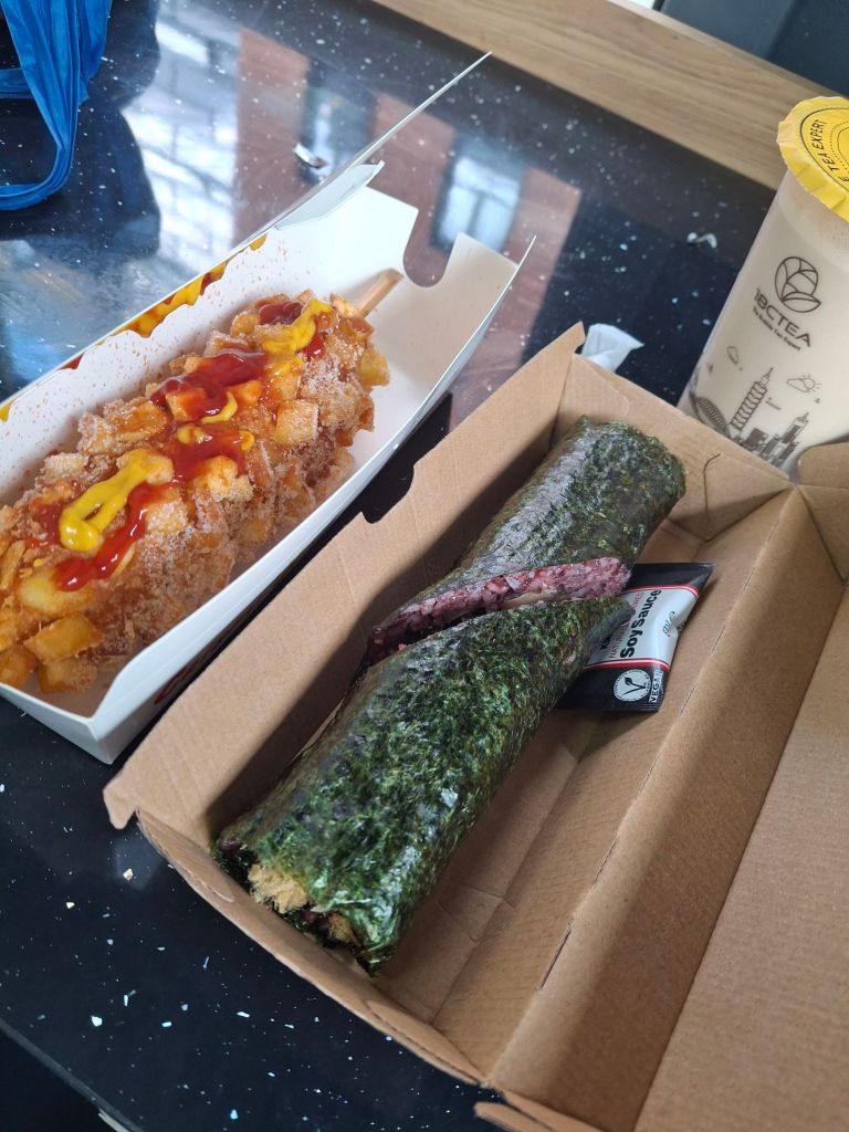 Turning up at Super Asia was like a dream, it was very much like 7-Eleven (what I’ve seen of it anyway) and had a section where you grab ice cups and make your own drink, cook up some noodles, buy snacks or order food. We both ordered corn dogs (which were HEAVENLY I tell you 😍 we both enjoyed them so much and know we’ll be going back for them 🙌 hell to the yes!) and I got a sushi burrito which tasted very healthy so I evened it out there 🤣. It had black rice in it: I order that whenever I see it as an option as I like the slightly nutty taste to it! I also got a bubble tea without the boba and my sis got me an ice cup which I opted to fill with a strawberry drink which was the perfect amount of sweetness. I also saw these BTS coffees but there wasn’t gonna be a decaff one was there? 😂