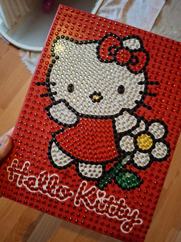 There weren’t enough green diamonds for the flower stem so I used extra silver instead and I think it turned out okay. I have one question tho for all of you diamond art pros out there: How do you get rid of all the stickiness on the canvas when you’re done?? π€ Google said talcum powder but I was worried it would coat and ruin the design. Since I did this diamond kit I have ordered some more from Temu and grabbed a sealant that I hope works. I’m really looking forward to trying out more kits. This Hello Kitty one was something I really got lost in and I’m hoping that feeling returns for the next projects!! Here is how the Skinnydip Hello Kitty diamond art painting turned out: