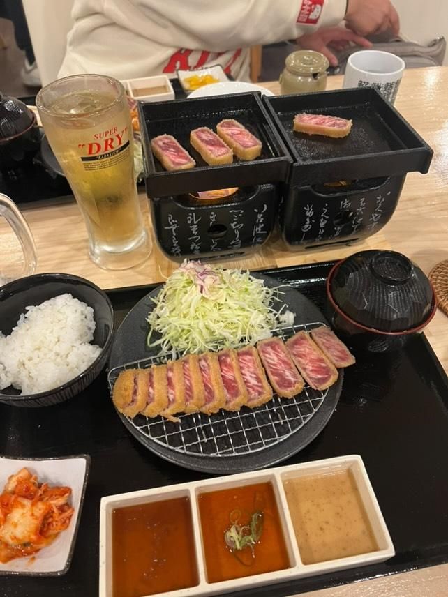 We then got drinks with designs ontop and I got the duolingo bird because they’ve got me through my stay in japan and I’m over 1065 days with my streak! 🤓 and my sister got a labubu design. My drink was caramel milk and my sisters was chocolate, mine was nicer if u must know! 🤣 Then we went above the drink store (that also sold acai bowls!) and fired our own beef cutlets!! And i also tried my first ever proper shrimp (I’ve had crisps flavoured with shrimp b4 but never actual shrimp. I hate prawn so it was a risk but I loved the battered shrimp!! The food cooked so fast and was so neat. By now my ankle was aching so we made our way back to the hotel around 6pm (it was only a five min walk) and I spent the rest of the evening with my leg up with ice. I was tempted to use my lush wicked bath bomb but then I found out that baths aren’t good for sprains so luckily I didn’t.